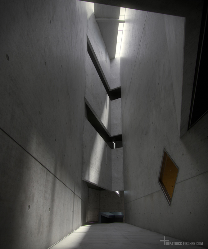 I rendered an interior shot of the jewish museum in Berlin. The museum consists of two buildings, one old courhouse from the 18th century and a new addition built by Daniel Liebeskind. An empty corridor called "Void" slices through the entire building. This is the part I show in my image.