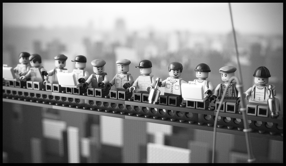 My version of the famous picture taken by Charles C. Ebbets in 1932 showing eleven workers eating lunch 840 feet above the streets of New York City. Just as a sidenode, the original photograph shows real workers, however it is believed that the moment was staged for promotion purposes. Then again, it was quite common during this period to work in such conditions without any safty harness.