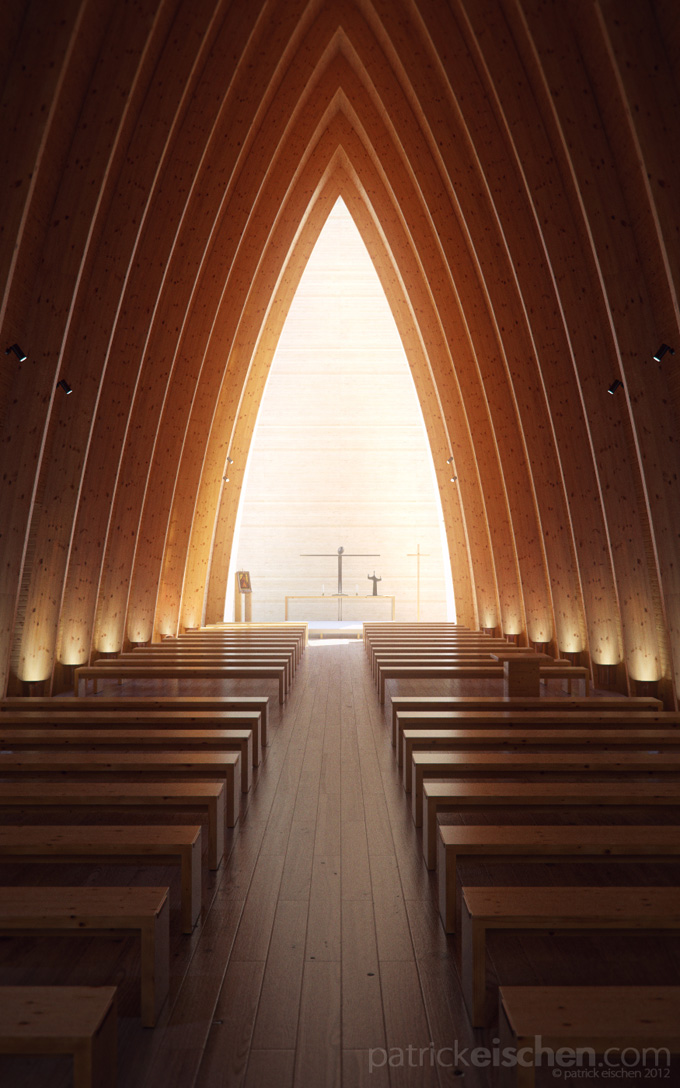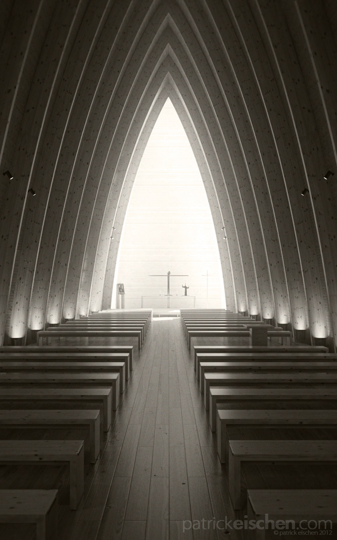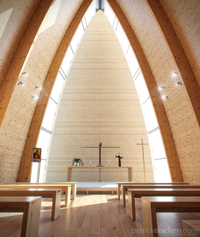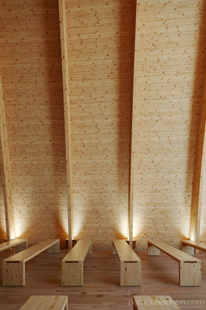 The St. Henry's Ecumenical Art Chapel, outside the city of Turku stands on a small hill on the island of Hirvensalo. The shape of the building follows the contours of the site and is constructed like an upturned boat. The chapel is divided into two parts: the chapel in the front part and a gallery in the back. The visitor can study the works of art during the service. The back of the church is only lighten by a small opening in the roof whereas the front has big windows on both sided of the altar. The idea was that one walks from darkness towards light from a hidden source. In the course of time, natural light will turn the tone of the timber to a reddish color.
